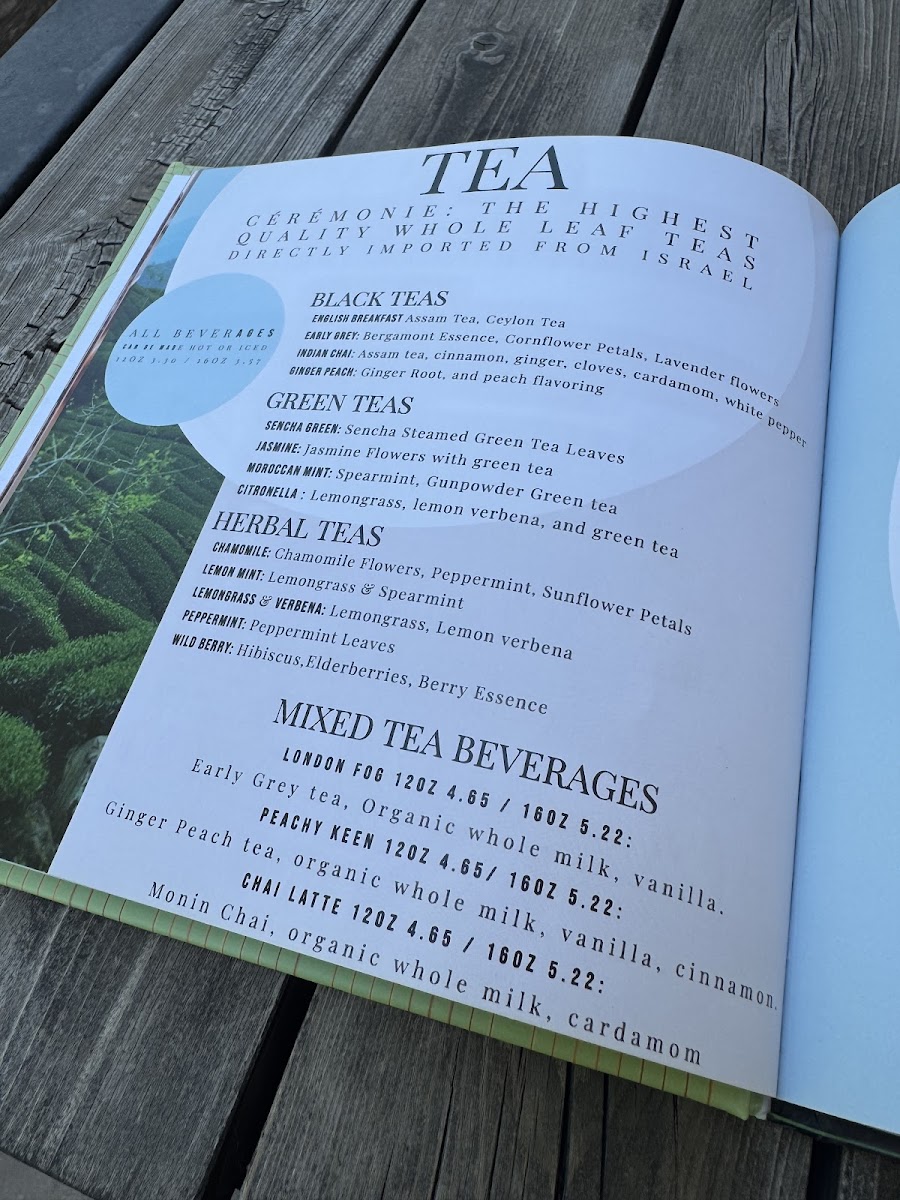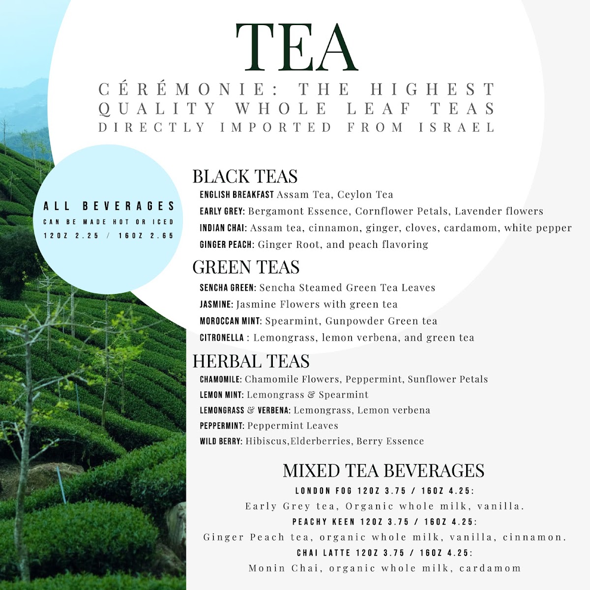 Cérémonie: The Highest quality whole leaf teas directly imported from Israel. Made to order, and can be hot or iced.