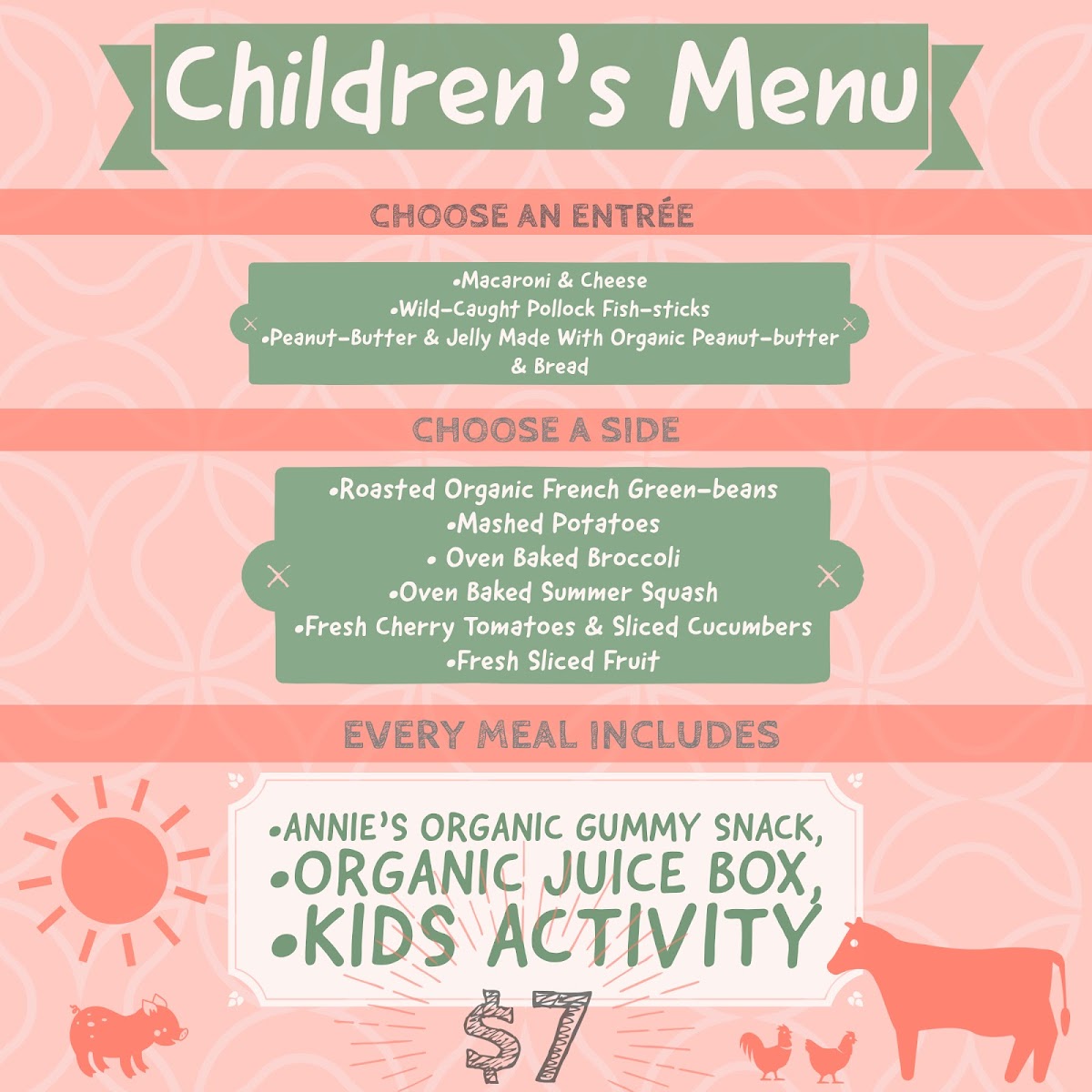 Choose between Macaroni & Cheese, Wild-Caught Pollock Fish-Sticks, or Penut-Butter & Jelly With choice of side: Mashed potatoes oven baked broccoli Baked Summer squash Sliced tomatoes and cucumbers sliced fruit